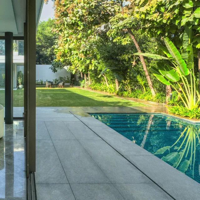 • Margelles en grès cérame : aspect contemporain, très faible absorption, résistance totale aux UV et au chlore, formats sur mesure taillés à la coupe